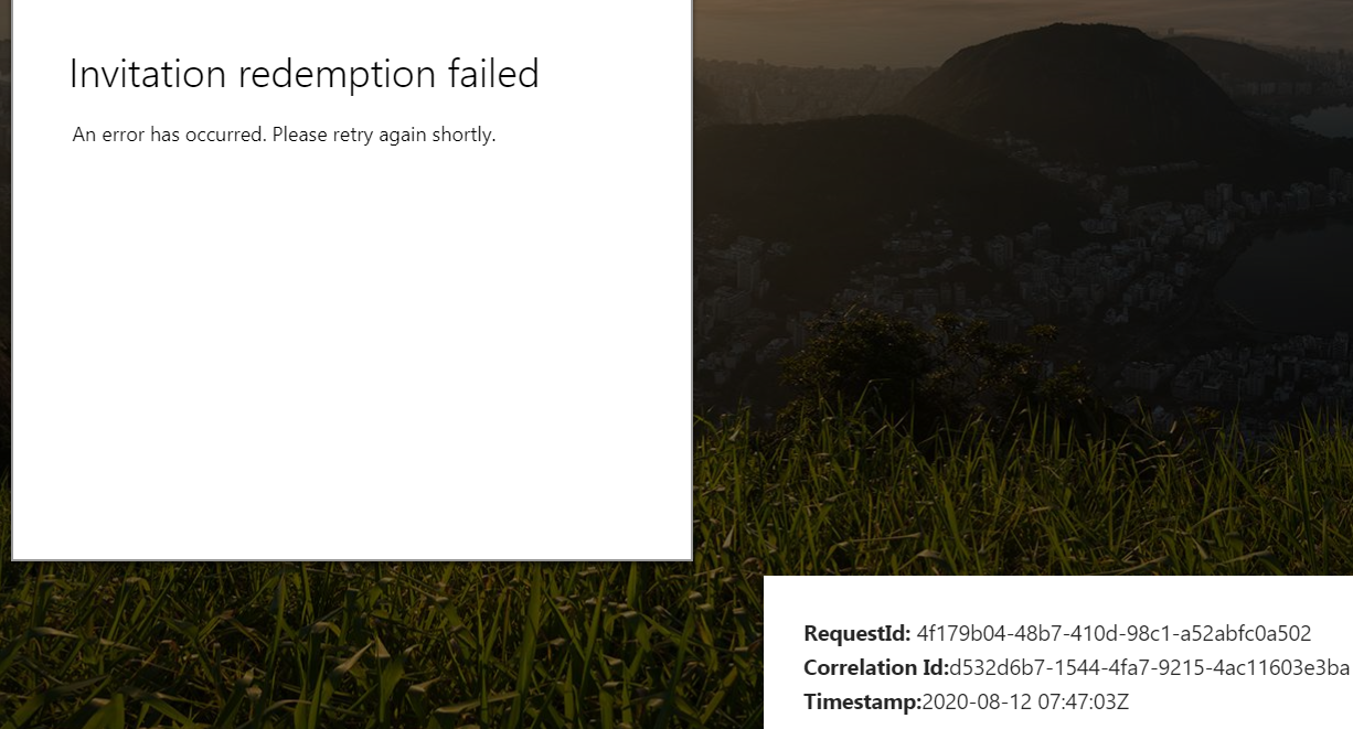 Invitation redemption failed. Invitation redemption failed Ive been invited as a guest into another org the Microsoft org none-the-less. ERROR - Unable to accept invite to another org.